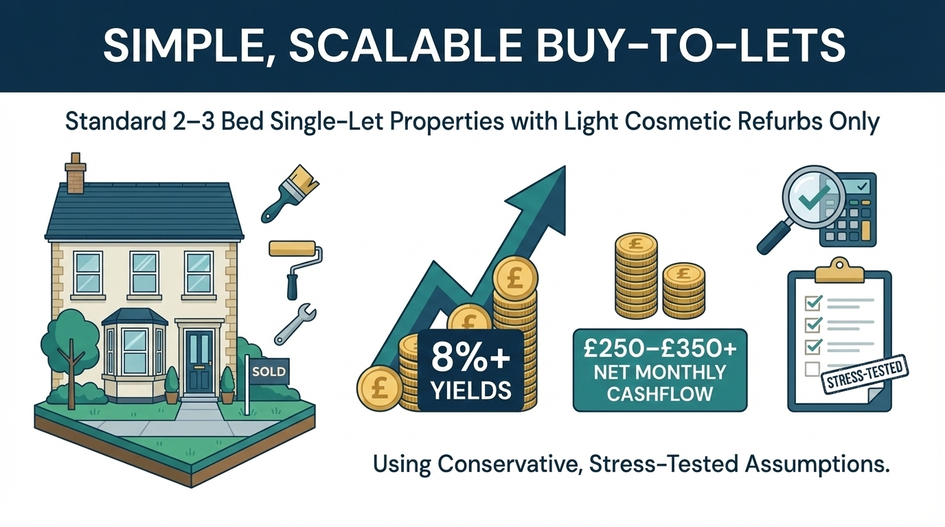 We target standard 2–3 bed single let properties with light cosmetic refurbs only, aiming for 8%+ yields and £250–£350+ net monthly cashflow using conservative, stress-tested assumptions.